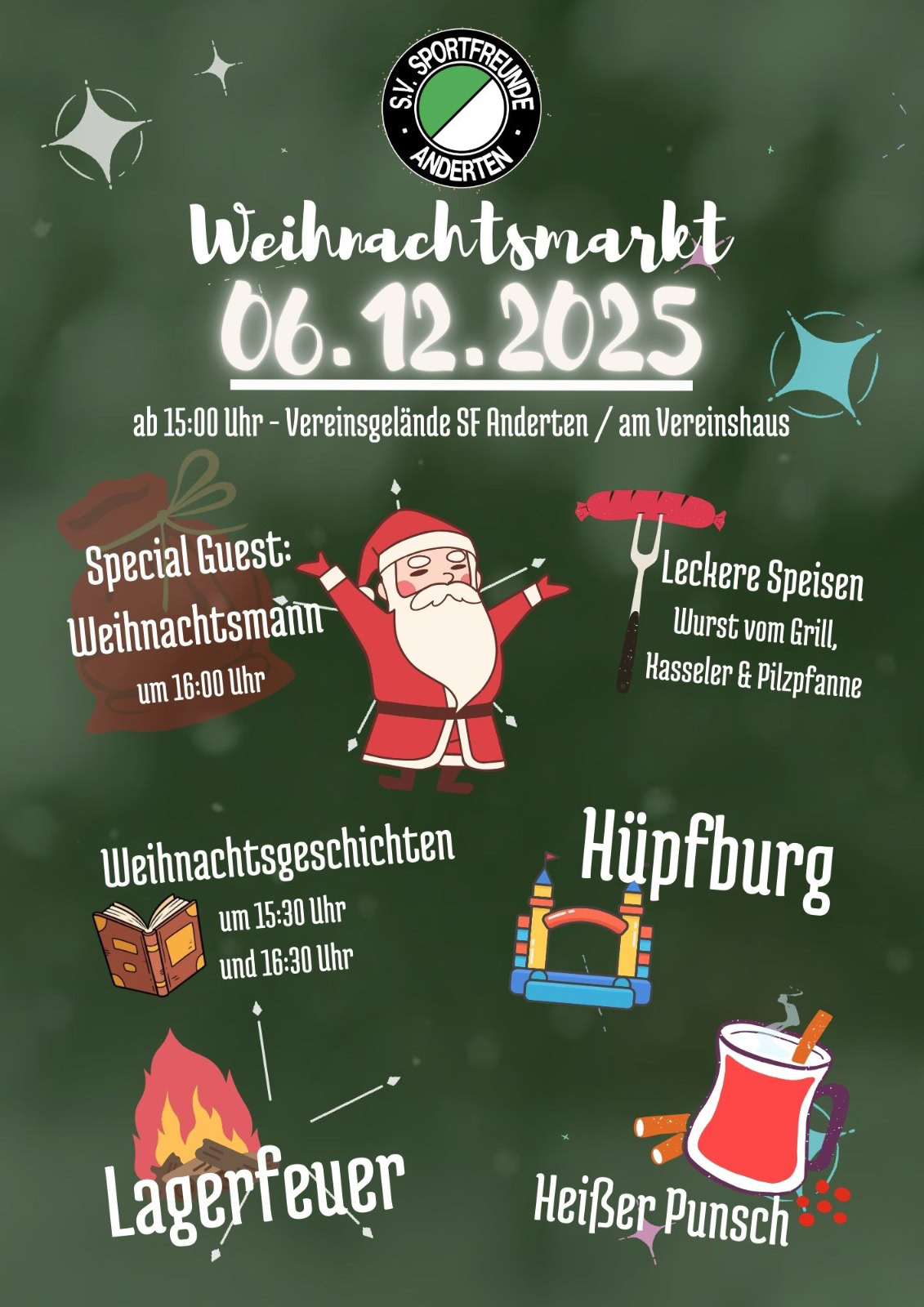 Wir benötigen Unterstützung beim Verkauf von Glühwein, Waffeln, Bratwurst, Bier, Kaffee und Softdrinks. Außerdem wird es wieder eine Aktivität geben: „Fussball-Darts“, an der ihr arbeiten könnt.